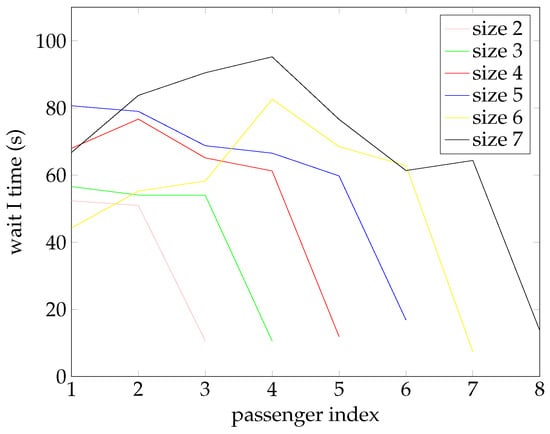 wait I time for passengers in events of different sizes. This figure shows that the largest events (sizes 7 and 8) first show an increasing mean