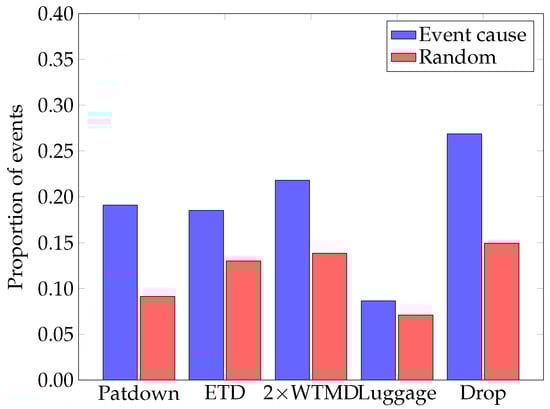 To be able to understand the potential causes of these events better, we look into five potential causes right before events: patdowns, luggage checks, ETD checks, repeated WTMD passages and slow luggage drops. While an employee is performing a patdown or ETD check, he cannot process any other passenger, causing them to wait. When a luggage check is being executed, the luggage belt of the system can become saturated. Following regulations, passengers and luggage are kept close together, and therefore passengers have to wait when the luggage belt is saturated. A second WTMD passage by a passenger causes the subsequent passengers to wait longer as well. Finally, a passenger that takes long to drop their luggage, may cause subsequent passengers to wait. We define a luggage drop to be slow, if it is slower than 1.5 times the mean luggage drop time.