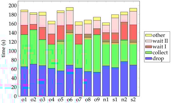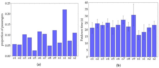 Figure 11 shows the mean security checkpoint times for passengers in the 13 different security checkpoint lanes. The mean security checkpoint times range from 162 s (lane n1) to 196 s (lane o6). This figure shows that on the experimental days (n1, s1 and n2, s2), the average passenger of the normal lane was faster than the service lane of that day. This is according to expectations. An interesting observation is that passengers in the two lanes of 18 December 2018 (n2 and s2) are slower than both lanes on 17 December 2018 (n1 and s1). The most important reason for this is the increased mean
