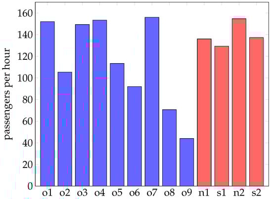 We calculated the occupation of the system in the considered 45 min period, by calculating the mean number of passengers that were in the system in that period. This system occupation is shown in