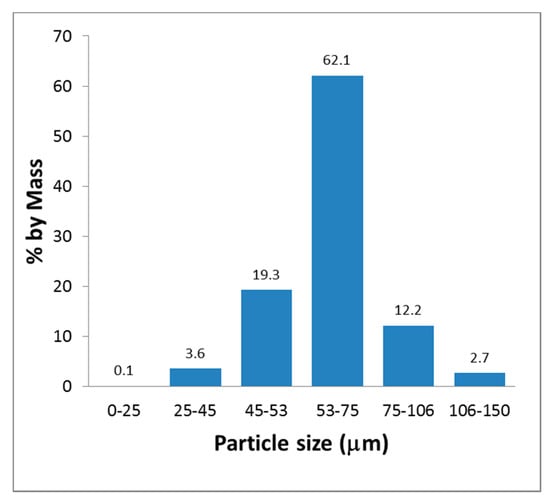 Raw materials used in EBM are metallic particles obtained from powder metallurgy. Some powder features strongly affect the process performance. The main factors in EBM affecting processing conditions are the flowability, powder packing and the heat transfer process phenomena. The powder used in EBM is spherical in shape because contributes to improve flowability and, thus, may ensure high build rates and part accuracy. In general, fine powder is used in EBM. The powder size distribution also has a significant effect on the build part density, surface finish and mechanical properties [37]. The samples used in this study were manufactured by using Ti6Al4V atomized powder with spherical morphology. The spherical shape may contribute to improve flowability and may ensure high build rates and accuracy [38]. The powder flow rate measured according to [39] was found as 25 s/50 g. The apparent density according to [40] was 2.57 g/cm3. As regarding the particle size distribution, the percentage by mass of particle size in the range 45–106 μm was found equal to 93.7%, the percentage by mass of particle size, measured according to [41], is shown in Figure 1. The powder nominal chemical composition is summarized in Table 1. The whole Ti6Al4V powder characterization was provided by the supplier (ARCAM Company, Gothenburgh, Sweden) with a certificate of analysis. Such a document contains for the supplied batch of raw material, the results of the powder characterization in according to the above mentioned ASTM tests; i.e., the values of the powder flow rate, the apparent density, the particle distribution size and the chemical composition.