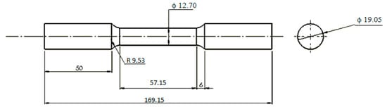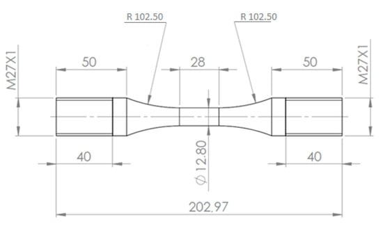 Round tensile samples were produced by EBM technology, with final geometry and dimensions compliant to the standard ASTM E08 [42] as shown in Figure 2.
