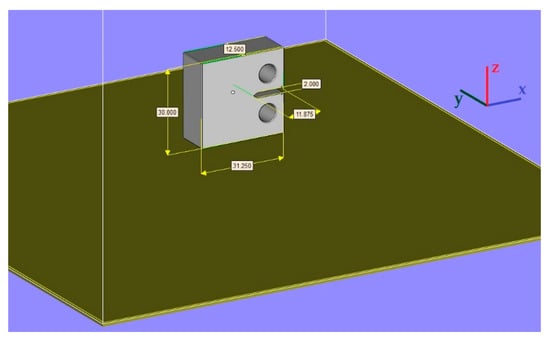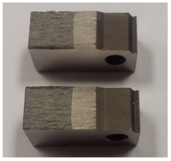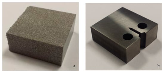 The samples were obtained by machining the external surfaces of n.6 parallelepipeds (35 × 35 × 15 mm) produced by EBM technology (Figure 8a). The biggest side of the parallelepiped was oriented parallel to the z axis and the notch was made along the horizontal direction (i.e., parallel to the building layer as shown in the sketch of Figure 7. This configuration was chosen because, according to [31,32,33], it is to be considered the weakest fracture toughness build orientation, i.e., that one related to the minimum KIC value. The notch was made by wire EDM (Electrical Discharge Machining). The final shape of CT specimens obtained by machining the 35 × 35 × 15 mm parallelepipeds produced by EBM is shown in Figure 8b.