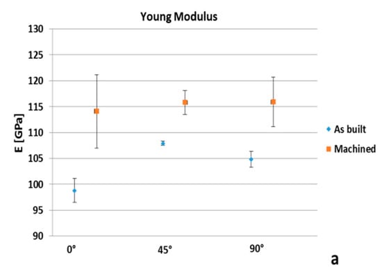 The lower values of tensile properties (ultimate strength, yield strength and Young modulus) of as built specimens compared to the machined ones are mainly due to significant reduction of the actual cross section caused by the high irregular external circular surfaces, as confirmed by the literature data on this topic [46,47].
