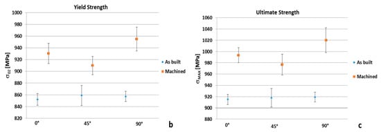 In Table 4 it is shown the tensile data of the “machined” set of specimens. In this table it is shown the tensile properties values of each tested specimen (i.e., tensile strength σmax, yield strength σ02 and young modulus E) and even a statistic of all the tensile properties (i.e., average, standard deviation, and relative standard deviation) gathered for each build orientation.