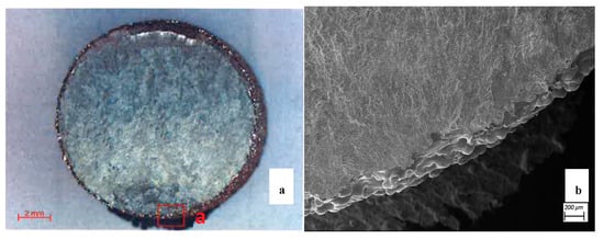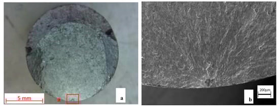 Macrograph of surface fracture of fatigue tested “machined” sample: (a) image of the surface at 7× magnification; in the “a” area is located the crack nucleation; (b) image of the crack nucleation area at 100× magnification.