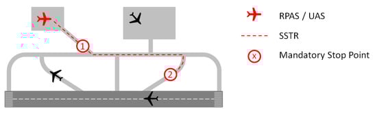 Figure 1. Sketch of a remotely piloted aircraft system (RPAS) taxi out movement using the proposed procedure. UAS = unmanned aircraft systems; SSTR = Segmented Standard Taxi Routes. - Implement published mandatory stop points along the taxi route for unmanned aircraft, splitting it into taxi route segments (red numbered circles in Figure 1).