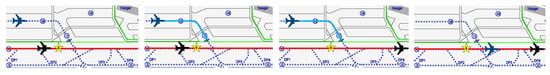 However, it is quite obvious that—in order to successfully develop a working integration concept for unmanned traffic on the airport surface—the first step is to reduce complexity of taxi guidance, expecting a probable loss of flexibility and aerodrome capacity to a certain extent. The solution that is taken here is based on procedures already applied for manned aircraft on some aerodromes, e.g., Antalya Airport, Turkey [13]. A detailed explanation of the approach and this procedure is provided in Reference [8], wherein the main idea is as follows: