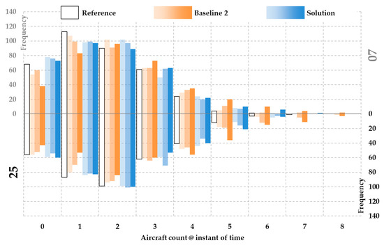 To further differentiate output derived from the simulations, the authors created a frequency distribution. Figure 7 shows the corresponding histogram of aircraft being counted on the ground. Results for runway direction 07 are displayed above the x-axis and those for runway direction 25 below the x-axis. Simulation scenarios are indicated by color (white = Reference, orange = Baseline 2 and blue = Solution); transparency is used to indicate the share of RPA in three steps (brightest tone = 10%, intermediate = 25% and full tone = 50% RPA). This calculation can be used as a direct indicator for controller task load.