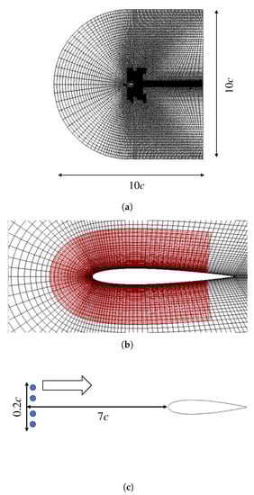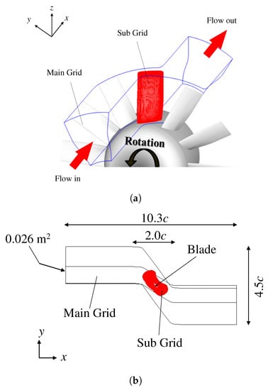 The computational grid for the flow around the wing and blade was established using an overset grid system involving two computational grids: the main grid, whose resolution is coarser than the sub grid and is used to obtain the global flow field; and the sub grid, with a fine resolution, used to obtain the precise flow field around the wing and blade. The present grid resolution has been validated in our previous study [], indicating that it provides reasonable results practically.