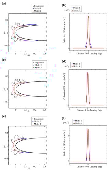 Comparison of ice shapes and collection efficiency for different SLD models: (a,b), Models 1 and 2; (c,d), Models 2 and 3; (e,f), Models 2 and 4.