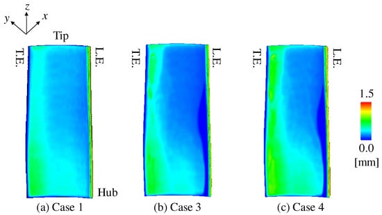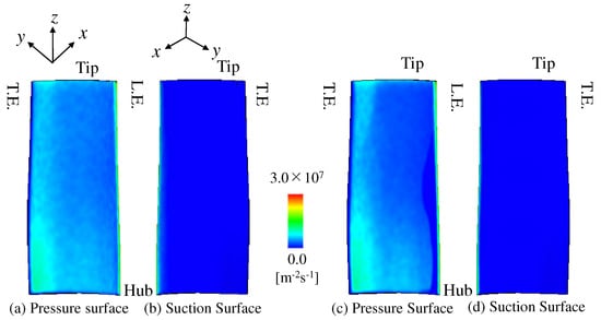 Figure 4 shows the comparison of the effect of the SLD models (splash-bounce, deformation, and breakup) on for the blade surface. The leading and trailing edges are represented as “L.E.” and “T.E.”, respectively. Figure 4a,b show the values of on the pressure and suction surfaces in Case 1, in which the SLD model is not considered. The maximum value of occurs around the leading edge because the droplet directly impinges and adheres to this area. On the pressure side, the values are distributed on the entire surface, and increases at the region close to the hub and trailing edge. On the suction side, is extremely small. Figure 4c,d show the pertaining to the SLD model of Case 2. The distribution is highly similar to that shown in Figure 4a,b. The values are distributed at the region near not only the hub but also the tip on the pressure side. On the suction side, is very small.
