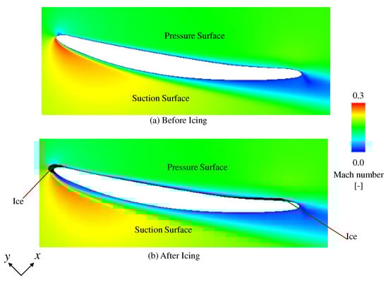 Figure 6a shows the flow field in terms of the Mach number at 90% span of the blade without the icing (i.e., before icing) for Case 3. In the suction side, flow separation occurs in the region close to the trailing edge. Figure 6b shows the flow field after the icing, that is, corresponding to the icing distribution at 15.0 s. The iced region (shown in black) appears around the leading and trailing edges on the pressure surface. The flow separation region expands owing to the icing.
