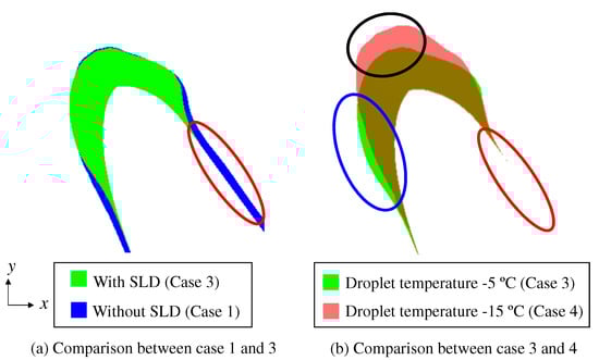 Figure 7 shows the ice shape around the leading edge at the midspan of the blade. Figure 7a presents a comparison of the effects of the SLD model on the ice shape, i.e., Cases 1 and 3. The icing occurs at the leading edge in Case 3, whereas the icing region expands in Case 1, as indicated by the red circle. These findings are in agreement with the ice thickness distribution, as shown in Figure 5a,b. Figure 7b shows the effect of the SLD temperature on the ice shape, i.e., Cases 3 and 4. In Case 3, the icing occurs at not only the leading edge (circled in black) but also the suction () side. The ice on the suction side close to the leading edge is the glaze ice generated by the water-runback (circled in blue), which occurs because the SLD temperature is relatively higher than that in Case 4. In Case 4, the ice at the leading edge thickens (circled in black) owing to the presence of rime ice; specifically, the SLD instantaneously freezes when the droplet collides on the surface. This phenomenon occurs because the water-runback and splash-bounce phenomena do not occur. In addition, the icing on the pressure side does not occur in both the cases, as shown by the red circle.