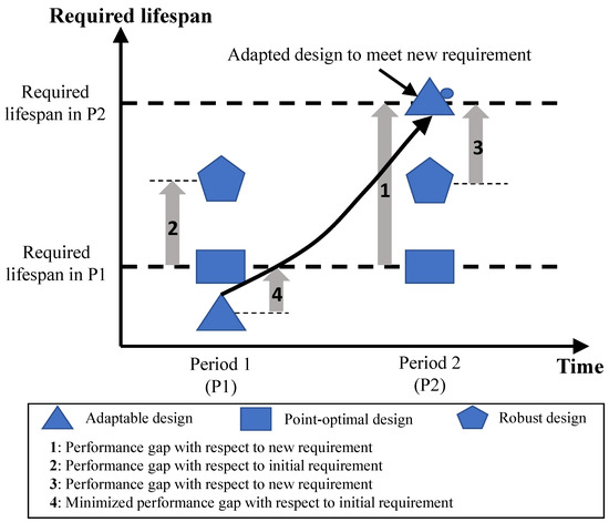 Robustness, on the other hand, is a separate design characteristic. Although both robustness and adaptability refer to the ability of a system to handle change, there is a difference between the nature of change and the system’s reaction to change in each case. Adaptability implies the ability of a design to satisfy changing requirements, whereas robustness involves satisfying a fixed set of requirements despite changes in the system’s environment or within the system itself [12]. Figure 1 illustrates schematically these three different design approaches. P1 and P2 are two different time periods during the component’s lifespan. P1 is defined as the initial time period during which the component design occurs and P2 as a time period during which changes in the required lifespan occur. As shown in Figure 1, traditional design approaches favor designs that are optimized to satisfy original requirements (point-optimal design). Over time, these requirements might change resulting in a performance gap. Uncertainty regarding future requirements makes it difficult to design for required design changes. One way of tackling this uncertainty in requirements is through adopting a robust component design. This will reduce the performance gap resulting from changes in requirements however will introduce a performance gap at the initial period due to the over-design of the component. Therefore, an alternative approach is to consider an adaptable component design. The chosen design characteristics may not be justified in the context of optimizing the system for the initial set of requirements, however, these characteristics will allow the system to evolve as requirements change during operation, reducing the performance gap (see Figure 1).