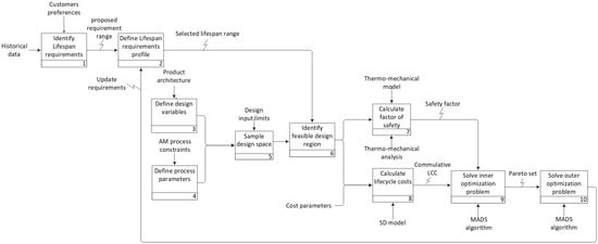 The methodology is based on integrating a dynamic LCC model with a nested optimization approach. The model allows the assessment of an alternative mean-of-life extension that uses AM to adapt component geometry during operation. Figure 2 provides a flow diagram in which the starting point is to select the required component lifespan range based on historical data and customer preferences. The selected range is used as an input to an optimization problem that determines the Pareto set of design alternatives associated with the bi-objective problem of minimizing LCC and maximizing performance, where a factor of safety is used to represent the latter. It is estimated based on results obtained using the thermo-mechanical analysis model presented in [56].
