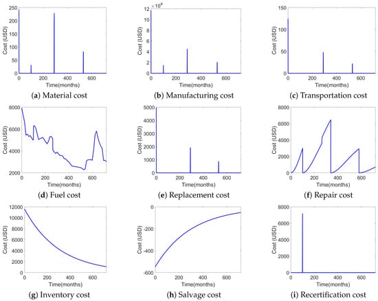 where K = 2 and = . Repair costs are linearly interpolated and proportional to the probability of failure and calculated in terms of US dollars per month. The present value of repair costs increases exponentially towards the end of a component’s design lifespan. As shown in Figure 4, component remanufacturing during operation reduces repair costs throughout its remaining useful life.