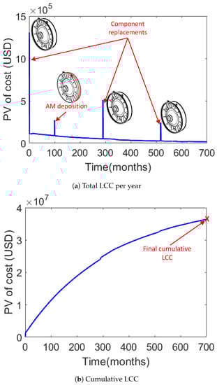 The total present value of the LCC per year is calculated by adding all nine cost components (cf. Figure 5a). An assumption is made that AM remanufacturing is performed only one time throughout the in-service phase; in the example used here, this happens at month 100 (first peak). The other peaks reflect costs associated with replacement processes occurring at the end of the product’s design life. The presented model considers the scenario where the entire TRS is replaced at the end of its lifespan. The TRS is repaired by AM if there is a change in requirements. While repairing the TRS by AM extends its lifespan, it is replaced at the end of the latter. Therefore, the lifespan of the TRS depends on its initial design parameters and whether it is repaired by AM. However, due to the value of the considered in-service period (700 months) and the assumption that AM remanufacturing is performed only once throughout the in-service phase, several TRS replacements may be required. The cumulative LCC over time is shown in Figure 5b. The final value at the end of the desired service period is used as the objective to minimize in the optimization problem.