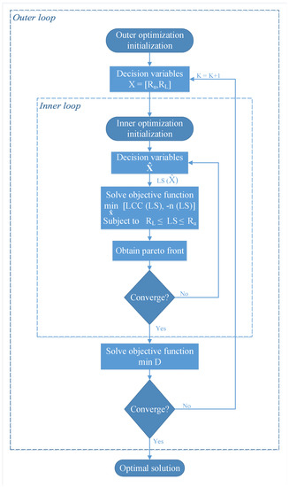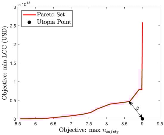 An inner optimization problem is solved to obtain design solutions that minimize LCC and maximize performance. Since there is a trade-off between LCC present value () and safety factor (n), a set of Pareto-optimal solutions is generated. The purpose of the outer loop is to determine values of the lower and upper bounds of the required lifespan range. This is achieved through solving an optimization problem to minimize the distance between the utopia point and the Pareto front generated by the inner optimization loop.