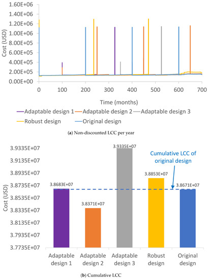 The non-discounted LCC over time is shown for each design in Figure 7a. The cumulative LCC at the end of the in-service period (assumed to be equal to 700 months) is shown in Figure 7b.