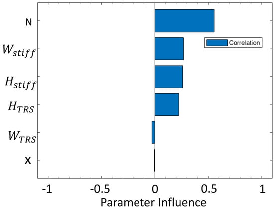 A sensitivity analysis was conducted to identify the variables with the highest impact on LCC. Specifically, the deposited stiffener axial position, width, and thickness, the TRS shroud width and thickness, and the deposition time were considered. The ranges of the variables are the ones listed previously in Table 2. Price fluctuations during the in-service phase were taken into account. The Sensitivity Analysis tool in Simulink® was used to conduct Monte Carlo simulations and study the influence of different parameters on the model output. All input parameters were assumed to have a uniform distribution. The obtained results are depicted in the tornado plot of Figure 9.