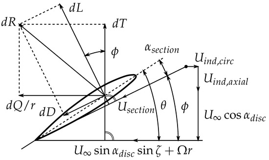 Inflow characteristics of a propeller’s blade section under non-axial inflow. The non-axial inflow influences the local lift and drag , and furthermore, the local thrust and portion of propeller torque [12].
