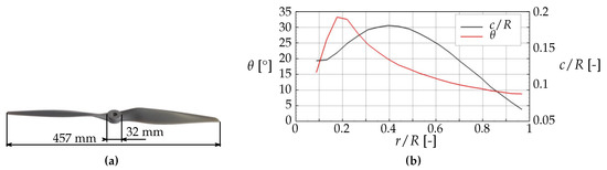 The experiments were performed in the wind tunnel A of the Chair of Aerodynamics and Fluid Mechanics of the Technical University Munich. Its nozzle is 1.8 m in height, 2.4 m in width; its test section is 4.8 m long. The turbulence intensity was 0.4%; the maximum velocity was 60 m/s. Small-scale two-bladed fixed-pitch propellers APC 18x8E of the company APC Propellers were used. The propellers have a diameter of 18 inch (0.46 m) and a geometrical pitch of 8 inch (giving a pitch angle at the radial location of 10.7°). Their chord length and twist angle distribution can be seen in Figure 4b.