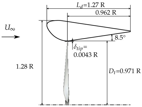 The geometry of the duct is designed for operating conditions with very low advance ratios or even static thrust, respectively, including a large inlet radius and profile thickness and a wide diffusor angle. The measures of the duct can be seen in Figure 5. For the operation inside the duct, the rounded blade tips of the propeller model are cut at a radius of mm (around three percent is cut off). It is common to use individually designed propellers with long chords until the blade tip and blunt blade tips to reduce the flow through the blade tip gap [19]. In this work, the same propeller was used both in an open and a ducted configuration (except the adaption of the blade tip). The intention was to provide an easier comparison of both concepts.