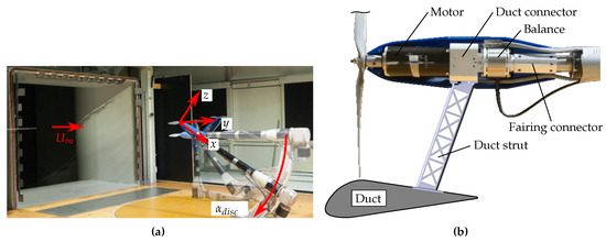 To drive the propeller, a speed-controlled direct current motor (Maxon Motor EC-60-167131, electrical power 400 W) was used. Its backside was connected to a six-component internal balance (K6D40 200N/5Nm/CG of the company ME-Meßsysteme GmbH) to obtain the aerodynamic loads with a resolution of 0.5 N/0.005 Nm in thrust direction and 0.2 N/0.005 Nm perpendicular to the thrust direction concerning the balance’s full range of measurements. The balance’s sample rate was 300 Hz. In order to achieve steady loads, the measurements were averaged over thirty seconds or for around 9000 samples, respectively. At a rotational speed of rpm this corresponds to around 2000 revolutions. To measure the aerodynamic forces of the models only, the assemblies of the motor and balance were contained by a 3D-printed, closed, self-holding fairing (see Figure 6b). Between the motor and the balance, a support was integrated for the mounting of the duct. The whole system could be rotated in the wind tunnel, enabling the measurement at inflow angles from to (see Figure 6a).