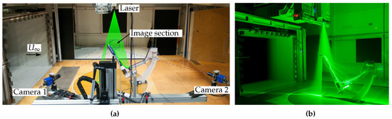 (a) Stereo-PIV setup. The laser and the cameras were mounted on uniformly moving traverse systems. (b) The laser illuminated the vertically aligned plane of measurement.