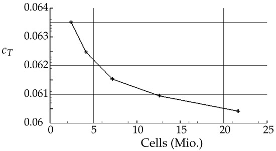The computational mesh consisted of two domains. One was an outer, static, hexahedral domain which contained the wind tunnel support geometry and had an edge length of 14 m (approximately 30 times the propeller diameter). Inside it, a second cylindrical domain contained the propeller geometry and rotated with the rotational speed of the propeller. Between both domains, a sliding mesh condition was applied. The meshing of the propeller domain was performed for the half of the cylinder, while the other side was mirrored. For the isolated propeller, a convergence study of the mesh size was performed by analyzing the static thrust under the test case m/s, and rpm. Five different meshes of increasing cell number but consistent blocking scheme were used. With Figure 8 it is apparent that the mesh with about 12.6 million cells provided a satisfying convergence. The propeller domain consisted of about 2.6 million cells; the others belonged to the outer domain. An impression of the grid at the representative blade section is shown in Figure 9b.