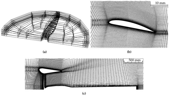 The grid of the ducted propeller configuration is defined accordingly. Inside the duct, it was kept fine in order to accurately resolve the occurring flow separation and interference effects between duct and propeller. The number of cells in its static domain was about 18 million cells; the propeller domain contained about 3 million cells. The meshing close to the geometry surfaces provided a dimensionless wall distance of to resolve the viscous sublayer accurately. In Figure 9c, the grid of both domains of the ducted configuration at the symmetry plane is shown.