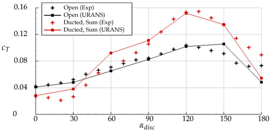 To validate the numerical setup, the thrust coefficients of the open and the ducted configuration are plotted in Figure 10 as derived both by experimental measurements and by numerical simulations; they show close agreement of both methods for inflow angles up to .