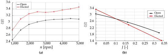 First, the steady loads are presented. In Figure 11a, the ratio of thrust coefficient to power coefficient , used as a measure for propeller efficiency, is shown for static thrust conditions (). The comparison of the ducted propeller with the open one shows that at static thrust conditions, the duct has a positive effect on the propeller efficiency. It increased for all analyzed rotational speeds as a nearly constant offset. The reason for this was an additional duct-generated portion of thrust due to the flow acceleration by the inlet lip, correlated with a suction zone, and the wake expansion and deceleration by the diffusor, respectively, correlated with increased static pressure behind the propeller plane. Those favorable effects may have been limited to some extent by the disadvantageous flow velocity increase in the propeller plane, correlated with a reduction of the propeller thrust portion.