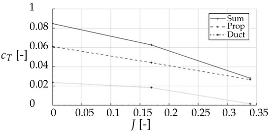 In the experiments, the total loads of both propeller and duct were measured together. On the contrary, with the computational results, the propeller and duct loads can be distinguished, enabling a more detailed analysis. In Figure 12, the thrust distribution of propeller and duct is shown. In static thrust conditions, the duct formed a favorable pressure distribution which produced around 28% of the total thrust. With a rising advance ratio, the aerodynamic drag of the duct was increasing which decreased the duct portion of the thrust. At the same time, the increased advance ratio lowered the propeller thrust as well. For an advance ratio of around , the thrust portion of the duct became zero. Eventually, for advance ratios greater than around , the rising duct drag overcompensated for its beneficial effects and the propeller became more efficient without the duct (see Figure 11b).