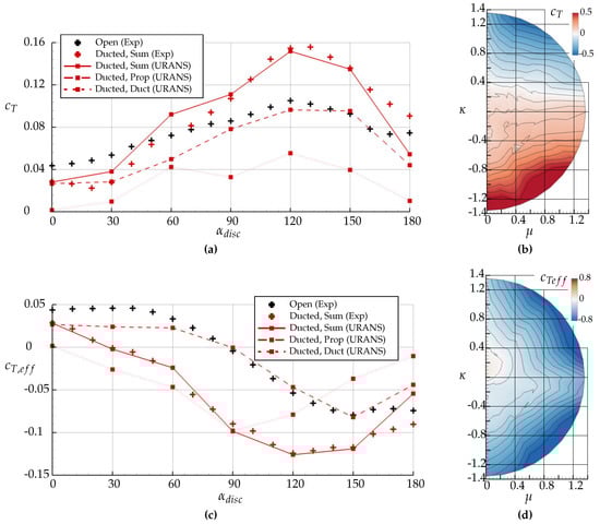 (a,b) Thrust coefficient and (c,d) effective thrust coefficient . (a,c) ; black: open propeller; red: ducted propeller configuration. (b,d) Plot of total loads of the ducted configuration over and . Wind tunnel data.