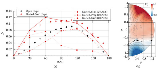 (a,b) Lift coefficient . (a) ; black: open propelle; red: ducted propeller configuration. (b) Plot of total loads of the ducted configuration over and . Wind tunnel data.