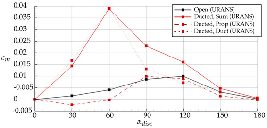 In Figure 15, the pitching moment coefficient is plotted over the inflow angle. Two findings shall be described here. First, for the ducted configuration, the pitching moment portion of the ducted propeller showed a zero-crossing. At smaller inflow angles, the propeller produced a negative pitching moment, which tended to rotate the propeller towards the inflow. This stable behavior was contrary to the isolated propeller and ended at an inflow angle of . For higher inflow angles, the pitching moment was positive. On the contrary, the duct experienced a positive (unstable) pitching moment for all inflow angles. Particular at an inflow angle of , the moment was very high and tended to rotate the duct away from the inflow.