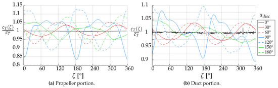 The total thrust of the ducted configuration is mainly produced by the propeller. Nonetheless, the duct increases the axial velocity at the propeller plane, especially at low inflow angles. Hence, the thrust portion produced by the propeller is reduced in comparison to the isolated propeller (see Figure 13a). Similar to the case of the isolated propeller, the propeller thrust of the ducted configuration increases with a rising inflow angle to a maximum at due to a variation of the local inflow angle and magnitude at the blade sections (see Figure 3). At higher inflow angles, the thrust decreases again.