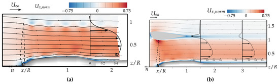 For an inflow angle of , a large portion of the flow field leeward of the isolated propeller showed an increased normalized axial velocity due to the aligning of the fluid towards the direction of the propeller axis (see Figure 23a). On the contrary, at the windward side, deceleration could be recognized due to the blockage effect of the support structure and the inner region of the propeller wake. The main flow structures of the propeller wake were still detectable downstream of the leeward side of the propeller plane, like the convecting tip vortices. Similarly to the flow field under axial inflow, one can recognize the blade wakes and their bending by the induction of the tip vortices. The root vortex bent away from the support structure, making it clearly visible in the propeller’s cross section as a zone of reduced axial flow velocity.