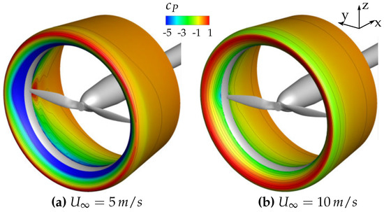 The formation of the blade tip vortices was prevented by the duct and replaced by a continuous shear layer surrounding the propeller slipstream. One can also see that the duct increased the flow velocity on the propeller plane, while reducing it downstream of the duct (the line plots at show a maximum normalized induced axial velocity of around for the isolated configuration versus for the ducted propeller). Furthermore, it is apparent that under the high advance ratio of , the duct cannot form an area of increased velocity and favorable suction at the inlet lip. Instead, nearly the complete forward-directed surface faces a decelerated inflow.