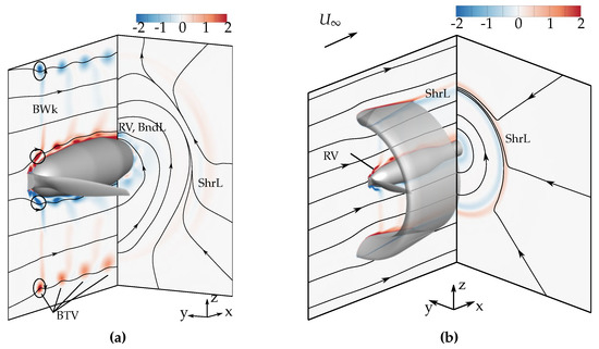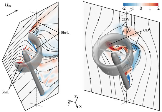 A more precise view of the flow fields of the isolated and the ducted propeller is enabled by the illustration of their normalized vorticity components perpendicular to two intersecting planes (see Figure 19a,b). The left planes are located in the cross-sections of the propellers (), showing the normalized vorticity in y-direction , illustrating, for example, the blade tip vortices and the blade wakes. The right planes are placed normal to the inflow direction in a distance of R and show the normalized vorticity in the inflow direction , reading
