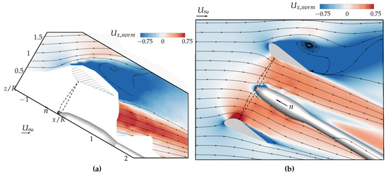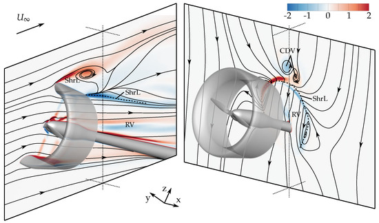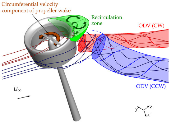 In comparison to the inflow angle , the flow inside the leeward recirculation zone is here more complex (compare Figure 22). Two counter-rotating vorticity components next to each other can be recognized which are accelerated by the conjuncture of the surrounding outer flow downstream of the duct. The opposing rotational sense results from the curved shape of the passing outer flow on both sides of the recirculation zone. Perpendicular to these vortices, two additional counter-rotating vorticity components on top of each other are formed (s-shaped green arrow). Their rotatianal sense is based on the outer flow passing over the recirculation zone and the propeller wake passing under the recirculation zone, respectively. Eventually, inside the recirculation zone, diagonally oriented and interfering movements occur.