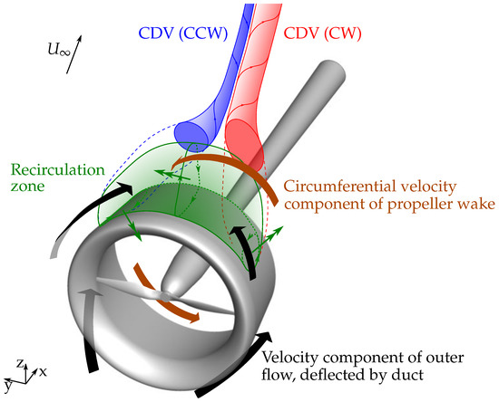 The first effect is the rotation inside the large-scale recirculation zone in leeward of the duct (green zone). Its rotation is illustrated schematically by the circumferential velocity and the rotation vector at three locations and can be described as a bent spiral. The second effect is the outer flow (black arrows). Upstream of the duct, its deflection results in velocity components on the y-axis facing away from the duct. Downstream of the duct, the outer flow is deflected towards the propeller wake around the duct surface. Still, due to flow separation, it does not penetrate the recirculation zone but sweeps on top of it and accelerates the rotational flow inside the recirculation zone.