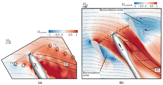 In the flow field of the ducted propeller, two large-scale regions of separated flow were formed due to flow separation at both the windward and the leeward inlet lips (see Figure 23b). At the duct’s windward inlet lip, a significant flow velocity peak was formed directly upstream of the propeller plane. Inside the duct, the recirculation zone narrowed the flow through the duct, causing another region of accelerated flow. On the contrary, the highly tilted duct surface caused a stagnation of the outer flow, similarly to the region close to the leeward inlet lip.