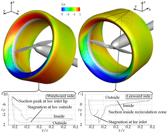 This velocity distribution resulted in a strong asymmetry concerning the static pressure, especially at the contours of the duct inlet lips. At the windward side, the highly accelerated flow formed a pressure coefficient of around (see Figure 24). In contrast, at the leeward side, stagnation occurred over a large portion of the inlet lip, resulting in a pressure coefficient of around . Another asymmetry was present concerning the outer flow as well, yet in a minor magnitude of versus . This strong asymmetry of the pressure distribution resulted in the largest detected pitching moment coefficient of around (see Figure 15).