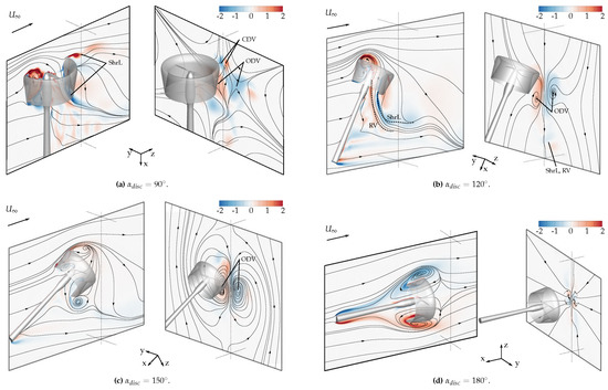 Besides the force analysis, the flow field, occurring under different inflow angles, was analyzed extensively in order to explain the found load characteristics. The URANS results enable detailed insights of the flow field, such as the evolution of the blade tip vortices; the wake contraction; and flow separation or the forming of shear layers and other complex vortex structures. The numerical data were validated by the experimentally obtained integral forces and by a comparison to complementary conducted flow field measurements by stereo particle image velocimetry (PIV).