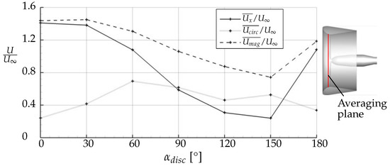 Inside the duct, one can see that at the windward side, half of the duct throat was blocked by the inner recirculation zone with two counter-rotating vortices. The flow passed through the duct only on the leeward side. Figure 28 shows the velocity components occurring at a section close to the propeller plane, area-averaged over the duct’s throat area. The data were obtained by one time-step of the URANS calculations.