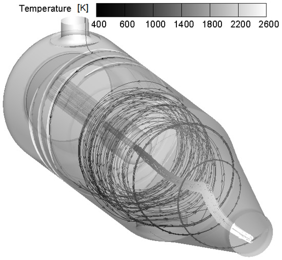 Streamlines distribution colored by temperature (cylindrical injector, Φ = 0.4).