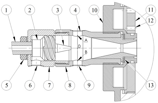 During this phase, many solutions for the CH4 injector geometry were tested; as a result, the conical injector configuration was selected and manufactured because of its ability to reduce the surfaces exposed to the aggressive attack of radicals combined with intense heat fluxes. The igniter assembly with the rocket motor shown on Figure 2 consists of the following components: 1—fuel inlet, 2—oxidizer injector, 3—fuel injector, 4—sensor interface, 5—fuel inlet fastener, 6—oxidizer inlet, 7—igniter casing, 8—combustion chamber, 9—spark plug interface, 10—oxidizer closure, 11—injector plate, 12—injector interface, 13—igniter sealing.
